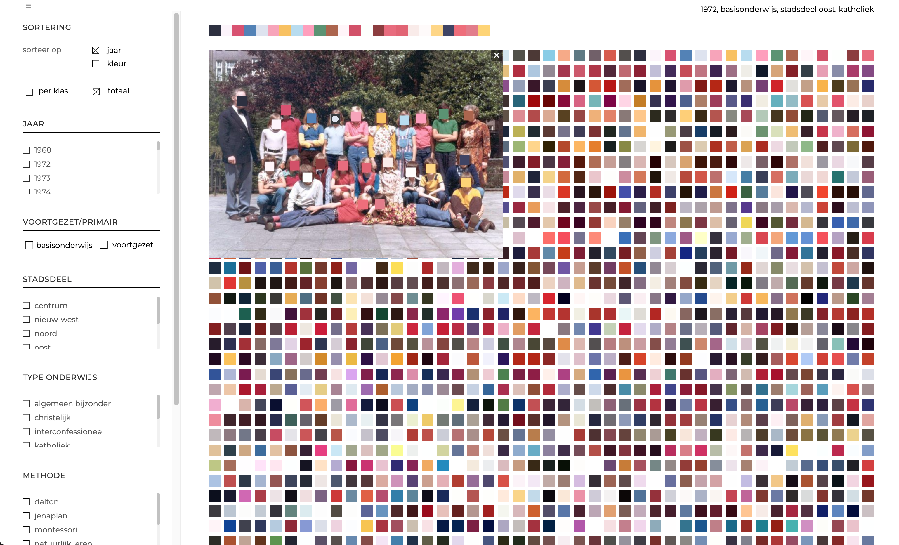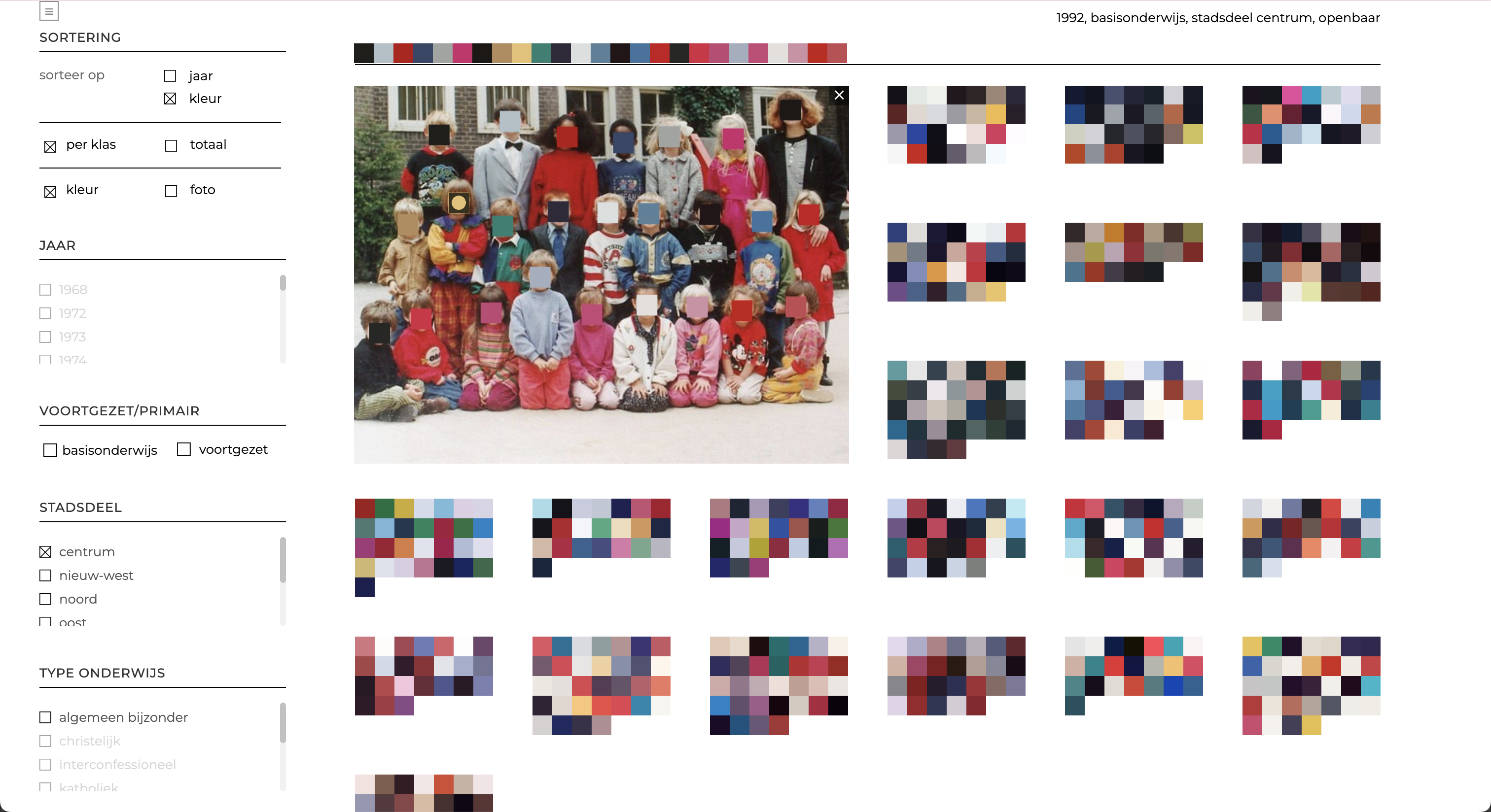 Hundreds of class photos from Amsterdam were collected and the colours of clothing in these class photos from 1970 onwards was researched. Findings were incorporated into an interactive database: klasopkleur.nl. Visitors can filter by district, year, type of education and type of school, revealing new colour patterns; a visual journey through fifty years of school culture.